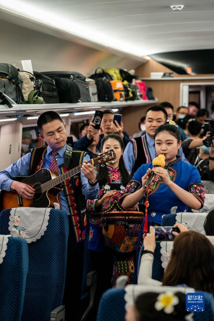 4月13日,乘坐首發(fā)列車的旅客在車上欣賞歌舞表演。新華社記者 胡超 攝