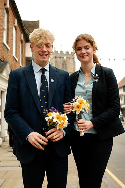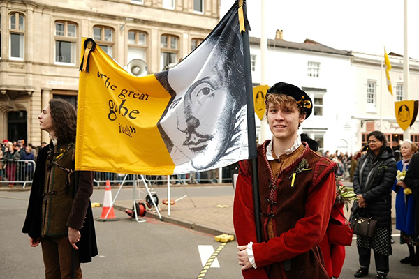 當(dāng)天四面八方的游客到來,給如詩如畫的小鎮(zhèn)增添了許多熱鬧氣氛。上午十時左右,斯特拉特福當(dāng)?shù)刂行W(xué)生以及來自世界各地代表組成的游行隊伍從市政廳出發(fā),一路走到中心廣場。數(shù)千市民游客聚集在街道兩旁,手持鮮花,為游行隊伍歡呼。游行隊伍里撫州市的代表們不時與市民游客互動,一同感受此刻的美好。一面印有莎士比亞頭像的黃色旗幟迎風(fēng)展開,各國國旗紛紛懸掛在街頭,當(dāng)?shù)孛癖姾陀慰妄R唱生日歌,向這位文壇巨匠致敬。來到斯特拉特福,不僅能近距離感受莎士比亞,也能“遇見”湯顯祖。薩翁故居以及市政廳里中國文學(xué)巨匠湯顯祖的塑像及有關(guān)介紹,吸引了不少游客的目光。