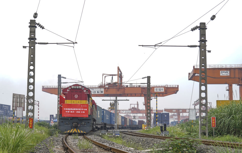 中老國(guó)際貨運(yùn)班列慶鈴汽車專列從重慶團(tuán)結(jié)村車站駛出(2022年6月8日攝)。新華社記者 黃偉 攝
