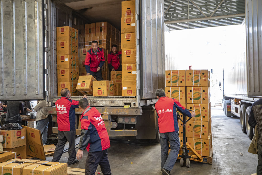 在重慶市江津區(qū)雙福農(nóng)貿(mào)城,洪九果品的工作人員在搬運(yùn)從泰國(guó)運(yùn)輸過來的榴蓮(2022年4月19日攝)。新華社記者 黃偉 攝