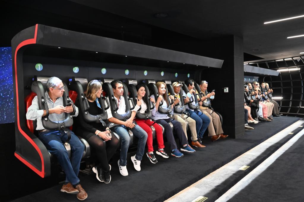 5月2日,洪都拉斯媒體代表團(tuán)一行在重慶市規(guī)劃展覽館體驗(yàn)“飛越重慶”飛行影院。新華社記者 趙佳樂(lè) 攝