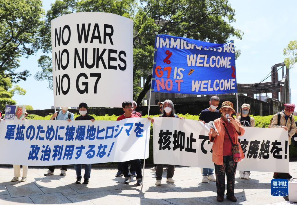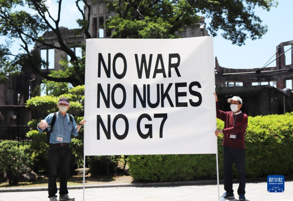 5月14日,在日本廣島和平紀(jì)念公園原子彈轟炸遺址前,日本民眾舉著“不要戰(zhàn)爭(zhēng)、不要核武器、不要G7”等標(biāo)語(yǔ),強(qiáng)烈抗議七國(guó)集團(tuán)(G7)峰會(huì)將在廣島召開(kāi)。新華社記者 楊光 攝