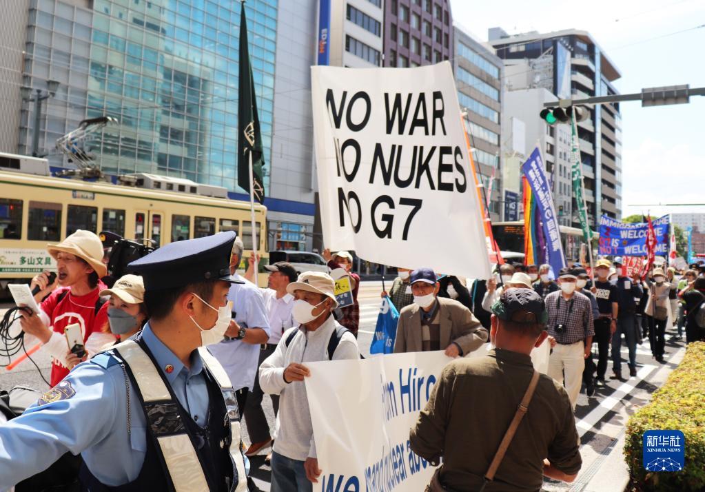5月14日,在日本廣島街頭,日本民眾舉著“不要戰(zhàn)爭(zhēng)、不要核武器、不要G7”等標(biāo)語(yǔ),強(qiáng)烈抗議七國(guó)集團(tuán)(G7)峰會(huì)將在廣島召開(kāi)。新華社記者 楊光 攝