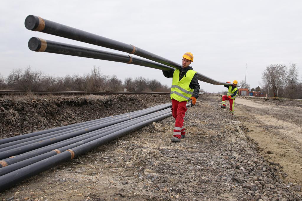2月22日,工作人員在匈牙利索包德薩拉什的匈塞鐵路匈牙利段工地搬運電纜保護管。新華社記者鄭煥松攝