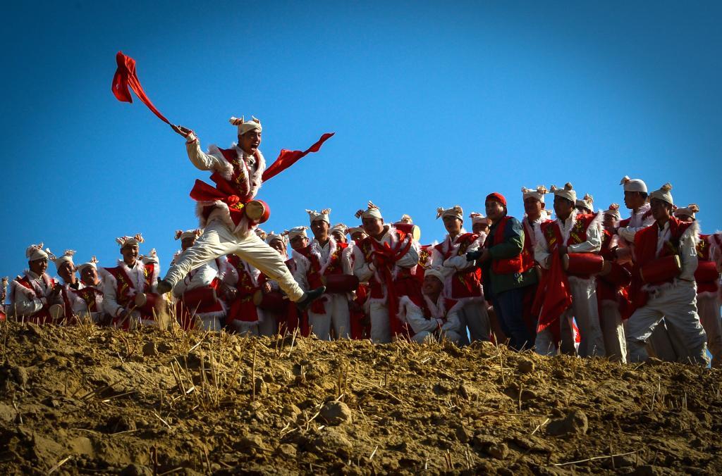 2013年2月22日,安塞腰鼓手在進(jìn)行山地腰鼓表演。新華社記者劉瀟 攝