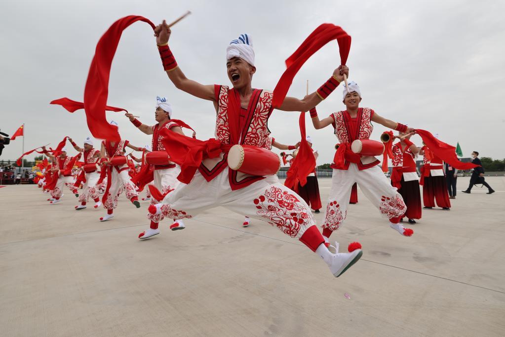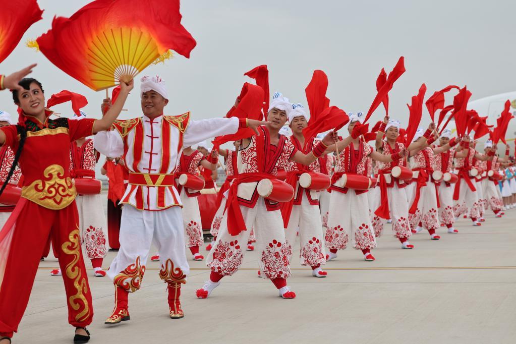 5月17日下午,當(dāng)?shù)孛癖娫谖靼蚕剃枃?guó)際機(jī)場(chǎng)以熱情的腰鼓、歡快的秧歌等民間藝術(shù)表演歡迎中亞國(guó)家貴賓到來。新華社記者邢廣利 攝
