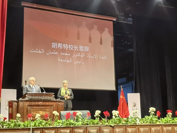 圖為開羅大學(xué)校長胡希特致辭。人民網(wǎng)記者 沈小曉攝 |