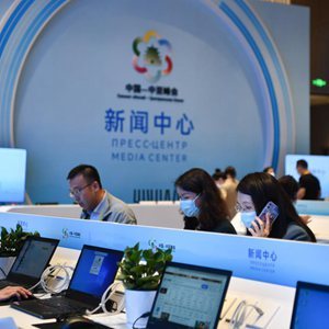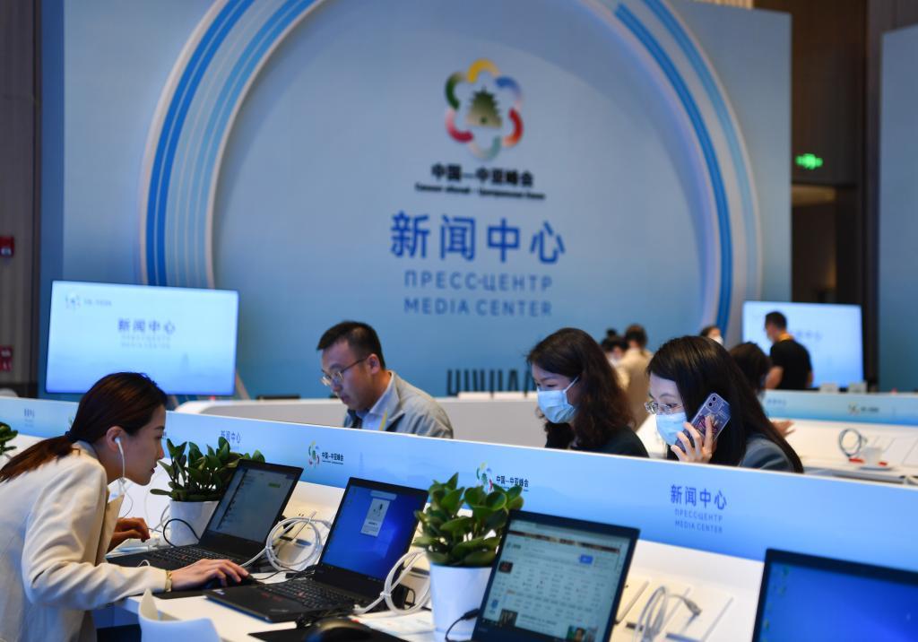 中國(guó)—中亞峰會(huì)18日至19日在西安舉行。在峰會(huì)新聞中心,來(lái)自不同國(guó)家的新聞?dòng)浾呔o張而有序地忙碌著。