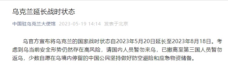 央視網(wǎng)消息:據(jù)“中國駐烏克蘭大使館”微信公眾號消息,烏官方宣布將烏克蘭的國家戰(zhàn)時(shí)狀態(tài)自2023年5月20日延長至2023年8月18日??紤]到烏當(dāng)前安全形勢仍然存在高風(fēng)險(xiǎn),請國內(nèi)人員暫勿來烏,已撤離至第三國人員暫勿返烏,少數(shù)自愿在烏境內(nèi)停留的中國公民堅(jiān)持做好防空避險(xiǎn)和應(yīng)急物資儲備。