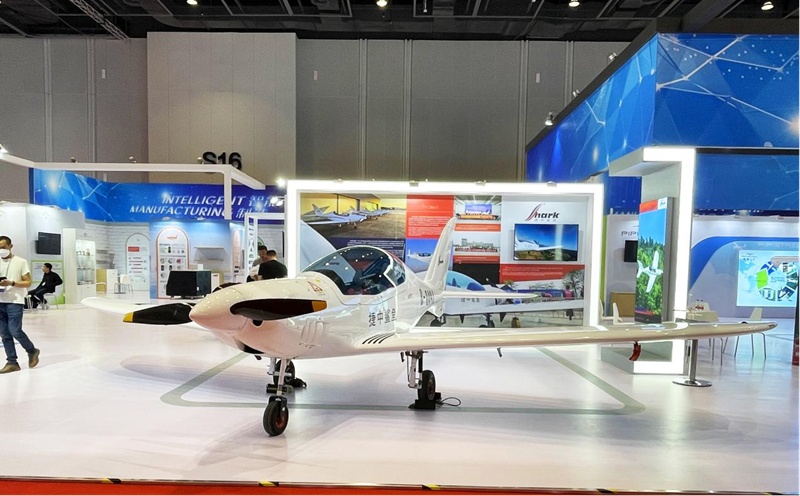 中東歐展館智能制造展區(qū)展出的捷克鯊魚飛機(jī)。新華網(wǎng)記者 吳寒冰 攝