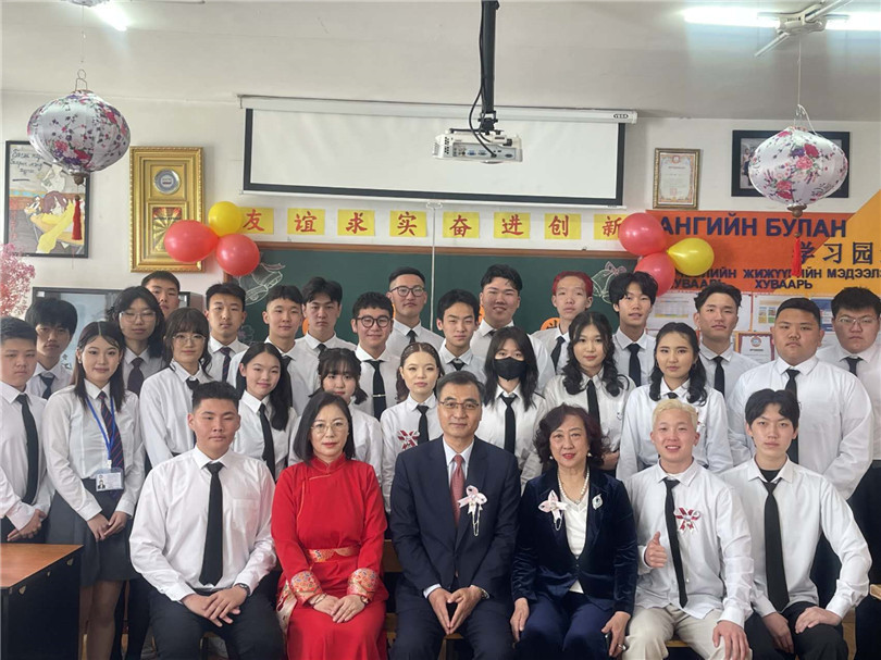 柴文睿大使與旅蒙華僑蒙中友誼學(xué)校師生合影留念。學(xué)校供圖