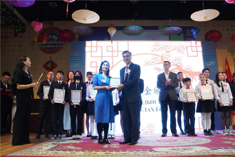 柴文睿大使為旅蒙華僑蒙中友誼學(xué)校優(yōu)秀生頒發(fā)大使獎學(xué)金。學(xué)校供圖