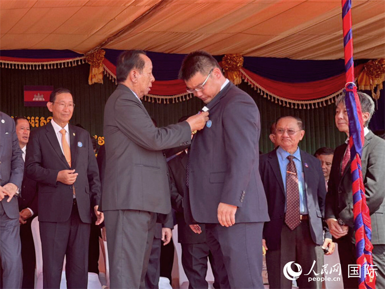 柬埔寨副首相兼國(guó)防大臣迪班在儀式上為中方建設(shè)者授勛。人民網(wǎng)記者 趙益普 攝 |