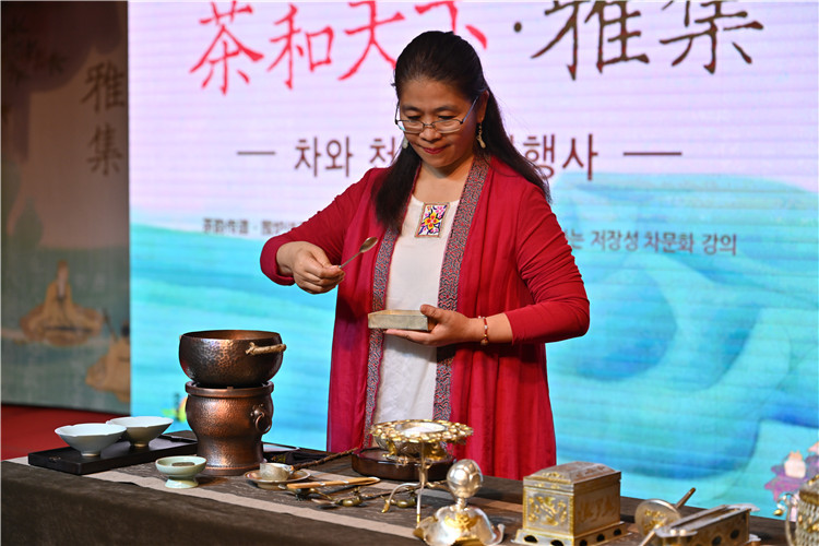人民網(wǎng)首爾5月24日電 (記者馬菲)首爾中國文化中心24日舉辦“茶和天下·雅集”活動之“茶韻傳道·圍爐談茶”。中國駐韓國大使夫人譚育軍、浙江省文旅廳副廳長李新芳、韓國亞洲新聞集團(tuán)會長夫人樸素鍊、《中央日報》國際部長姜惠蘭、首爾中國文化中心副主任孫燕、駐韓德國文化院長夫人傅嘉玲、貿(mào)促會駐韓首席代表俞海燕、大韓佛教曹溪宗社會部次長尹英喜、The L. Collection代表金秀炫、韓食文化交流協(xié)會會長柳賢美等30余位中韓兩國女性代表受邀出席本次活動。