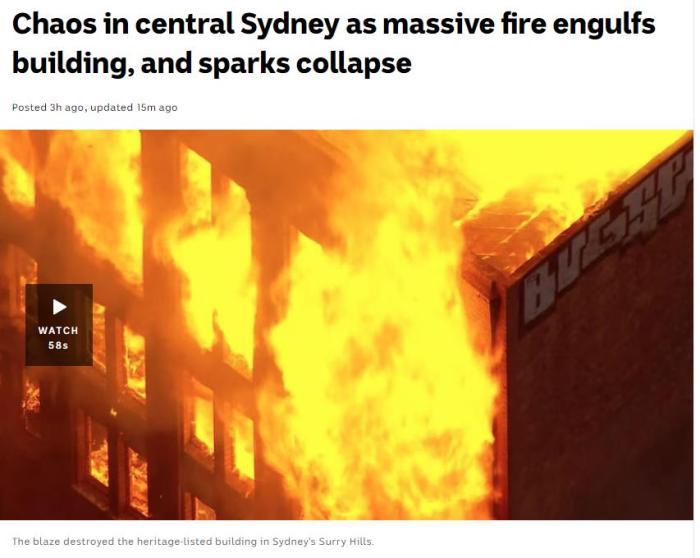 據(jù)報(bào)道,起火建筑位于悉尼中央車站附近的蘭德爾街,隨著火勢(shì)蔓延,大樓一部分開始坍塌。目前已有120多名消防員和30多輛消防車參與現(xiàn)場救援。