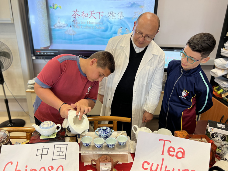 馬耳他圣瑪格麗特中學(xué)“中國(guó)角”師生正在泡茶。馬耳他中國(guó)文化中心供圖 |