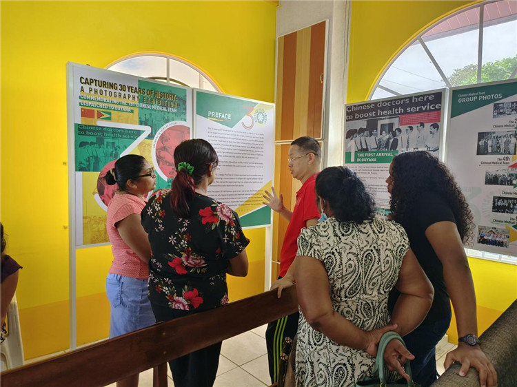 醫(yī)療隊(duì)員向當(dāng)?shù)孛癖娭v解醫(yī)療隊(duì)援圭30周年歷程。第18期援圭亞那醫(yī)療隊(duì)供圖 |
