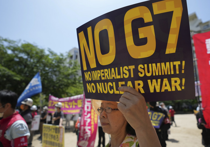 5月21日,民眾聚集在日本廣島袋町公園,抗議七國集團(tuán)峰會。新華社記者張笑宇攝