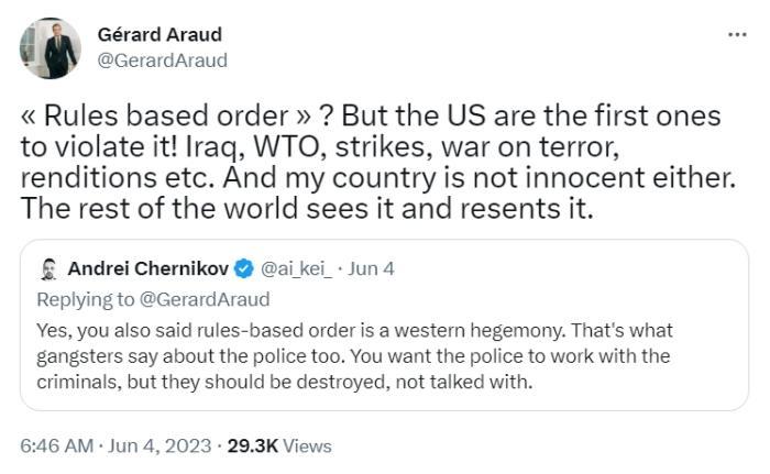 在另一條推文中,阿羅指出,從美國在伊拉克戰(zhàn)爭、世貿(mào)組織違規(guī)、所謂“反恐戰(zhàn)爭”中的表現(xiàn)可見,是美國首先違反了“基于規(guī)則的秩序”。世界上其他國家看到了這一點(diǎn),對(duì)此感到憤慨。