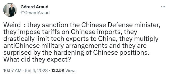 中新網(wǎng)6月5日電 日前,法國前駐美大使熱拉爾·阿羅在推特上提出一個(gè)值得思考的問題,“奇怪,他們(美國)制裁中國國防部長,他們對(duì)中國進(jìn)口商品征收關(guān)稅,他們大幅限制對(duì)華技術(shù)出口……現(xiàn)在他們反而對(duì)中國立場的強(qiáng)硬感到驚訝。美國到底想要什么?”