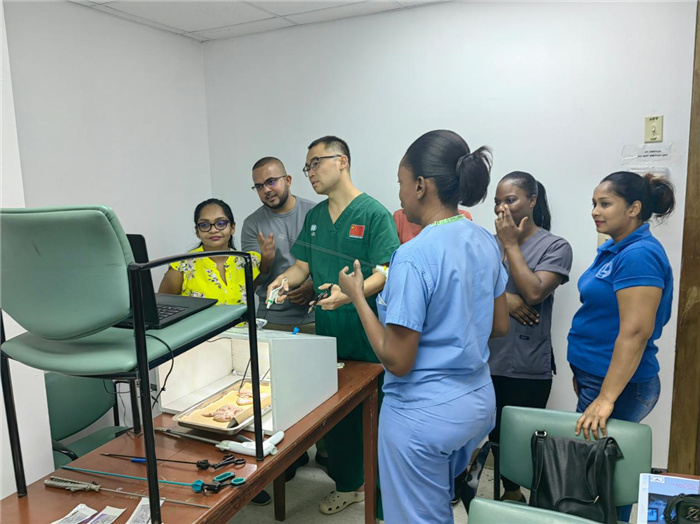 第18期援圭醫(yī)療隊抵圭以來,一直注重對當(dāng)?shù)蒯t(yī)生的帶教培訓(xùn)。醫(yī)療隊今年開展了圭亞那第二期住院醫(yī)師規(guī)范化培訓(xùn),同時協(xié)助喬治敦醫(yī)院建立了外科技能培訓(xùn)中心,并與中海油成立了進(jìn)修獎學(xué)金,資助優(yōu)秀醫(yī)生赴中國進(jìn)修學(xué)習(xí)。醫(yī)療隊希望通過此次培訓(xùn)班切實(shí)提高當(dāng)?shù)蒯t(yī)生的腹腔鏡技術(shù),從而進(jìn)一步提高圭亞那的整體醫(yī)療水平。