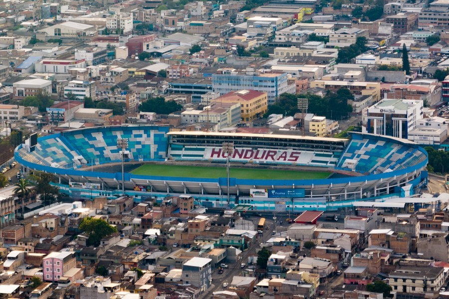 這是3月26日在洪都拉斯首都特古西加爾巴拍攝的國家體育場(無人機(jī)照片)。新華社記者辛悅衛(wèi)攝