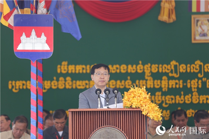 中國(guó)駐柬埔寨大使王文天在開(kāi)工儀式上致辭。人民網(wǎng)記者 趙益普攝