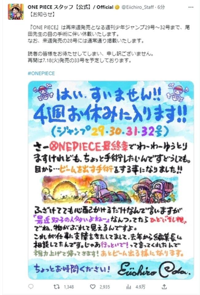 其官網(wǎng)還發(fā)布了尾田榮一郎在自己的手繪插畫上寫的“請假條”。他表示:“非常抱歉,我將休息四周時間?!逗胶M酢冯m然已經(jīng)進入終章,但由于眼睛的散光很嚴(yán)重,看東西時出現(xiàn)重影,所以需要做個手術(shù)。請給我一些時間(修養(yǎng)一下)?!?/p>