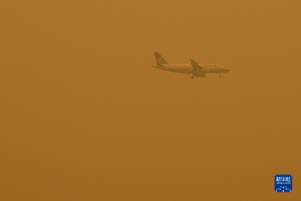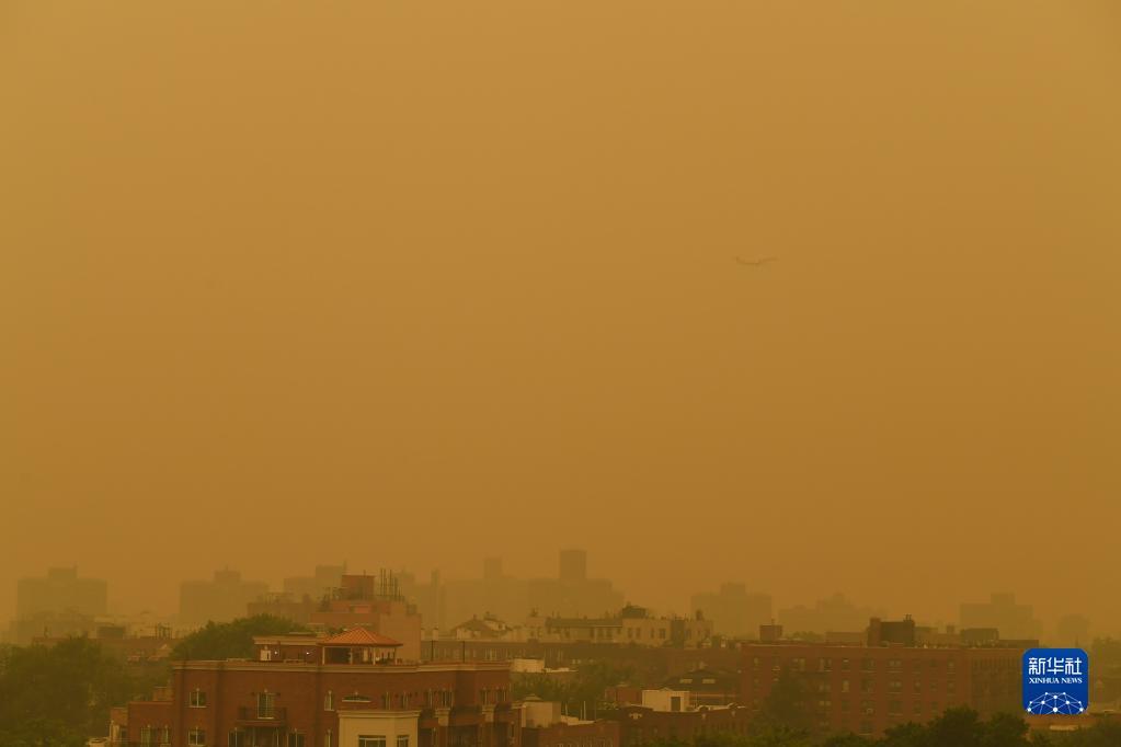 6月7日,一架飛機(jī)從煙塵籠罩的美國(guó)紐約上空飛過(guò)。新華社記者 李睿 攝