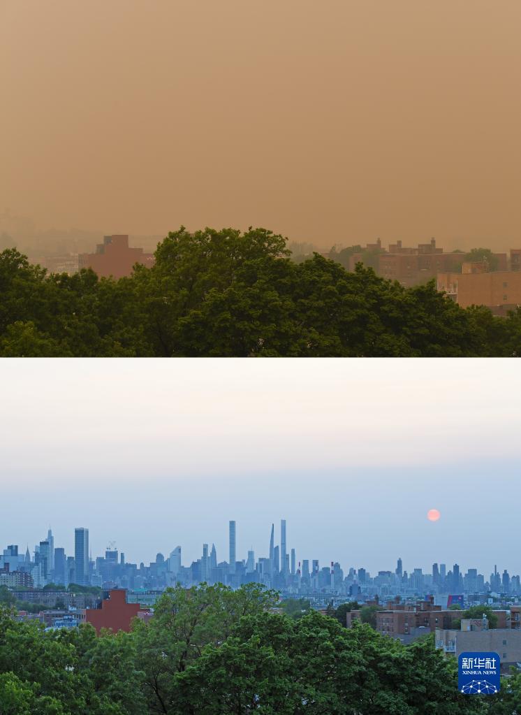 這張拼版照片顯示的是煙塵籠罩下的美國(guó)紐約(上圖,6月7日攝)和受煙塵影響前的紐約(下圖,5月21日攝)。新華社記者 李睿 攝