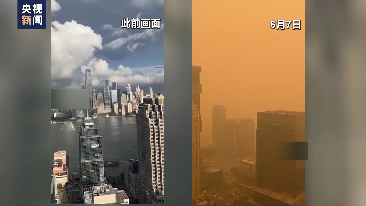 從7日上午開始,紐約市的能見度明顯下降。13時,當?shù)貥酥拘越ㄖ簬缀鯚o法看清。有網(wǎng)友在社交媒體上傳了對比畫面:在紐約曼哈頓,相比幾天前,7日的大樓幾乎消失不見。