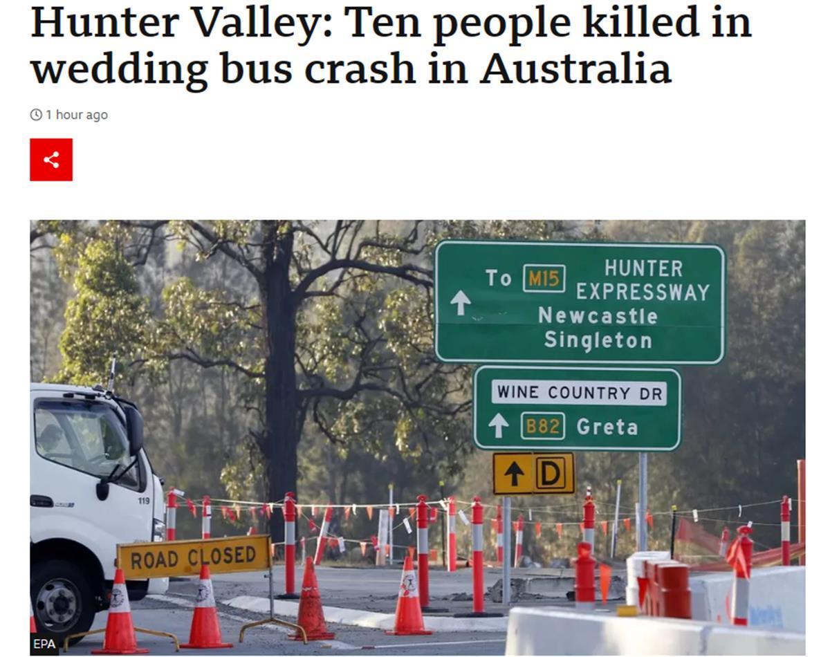 綜合《衛(wèi)報(bào)》、英國(guó)廣播公司等媒體報(bào)道,當(dāng)?shù)貢r(shí)間6月11日晚,澳大利亞新南威爾士州發(fā)生一起交通事故,一輛載有約50人的大巴車在一個(gè)環(huán)形交叉路口突然翻車。截至目前,事故共造成10人死亡、25人受傷。