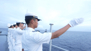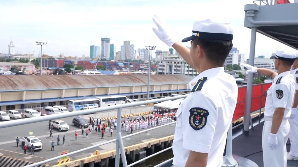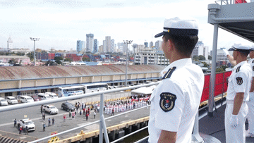 當(dāng)天早上,懸掛中菲兩國國旗的戚繼光艦航行至馬尼拉港外海,與菲方艦艇會合,進(jìn)行過航演練。演練結(jié)束后,戚繼光艦緩緩駛進(jìn)馬尼拉港。
