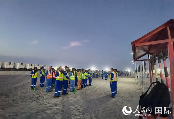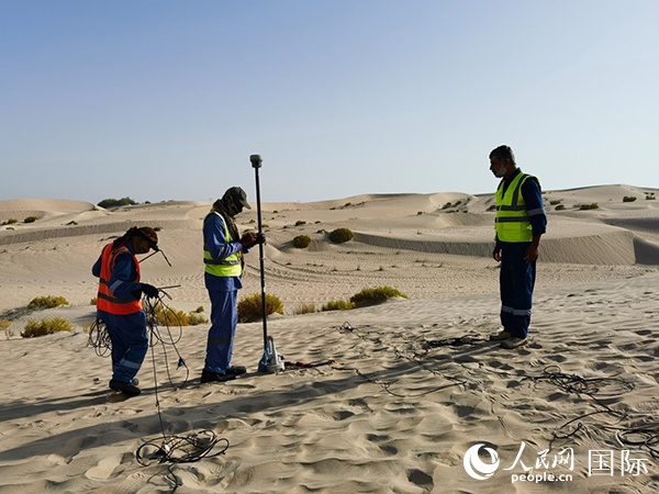 記者日前到項(xiàng)目營地探訪時(shí),正值作業(yè)沖刺期。清晨5時(shí),天剛蒙蒙亮,參加完安全晨會(huì)的工人分批乘坐卡車出發(fā),前往作業(yè)現(xiàn)場(chǎng);不到十分鐘,100多臺(tái)車輛載著600多名工人全部駛離營地。擺線、埋線、接線……工人們熟練地沿著設(shè)計(jì)好的線路前進(jìn)。記者站定了解地震勘探原理的不長時(shí)間里,工人們就已經(jīng)走出很遠(yuǎn),隱沒在沙丘中?!艾F(xiàn)在氣溫已經(jīng)比較高,尤其在沙漠里,所以工人早上出工比較早,每人每天完成50至60道采集設(shè)備的擺放,基本都能在下午正熱前返回營地。”穆罕默德介紹。