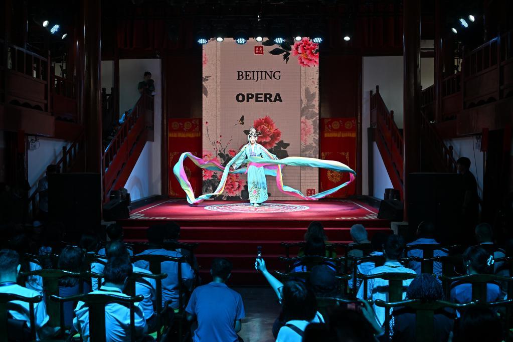 穿過(guò)小橋流水,外賓們來(lái)到青云胡同。在有著四百年歷史的顏料會(huì)館,外賓們不僅了解到東城區(qū)會(huì)館活化利用、“會(huì)館有戲”等文化創(chuàng)新舉措,還觀看了中國(guó)傳統(tǒng)京劇表演,親身感受老會(huì)館煥發(fā)出的新魅力。