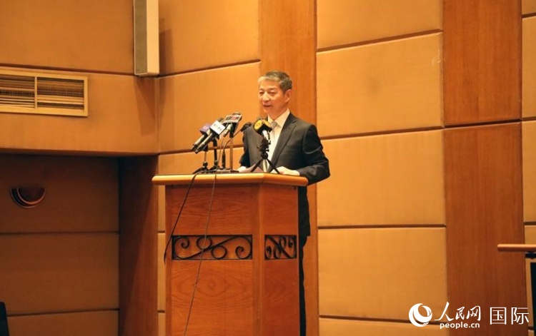 中國(guó)駐埃及大使廖力強(qiáng)現(xiàn)場(chǎng)發(fā)言。人民網(wǎng)記者 沈小曉攝
