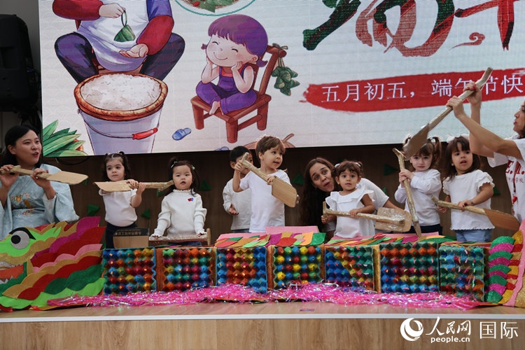 除了演唱中文歌曲、背誦中國古詩名篇外,該校高年級學(xué)生還在老師的帶領(lǐng)下自導(dǎo)自演了有關(guān)端午節(jié)來源的中文短劇,生動(dòng)展示了愛國詩人屈原以身殉國投入汨羅江的故事以及后人包粽子、賽龍舟等紀(jì)念活動(dòng)的來歷,引得現(xiàn)場觀看的家長和老師掌聲連連。表演活動(dòng)結(jié)束后,師生、家長共同體驗(yàn)了包粽子,感受傳統(tǒng)民俗魅力。