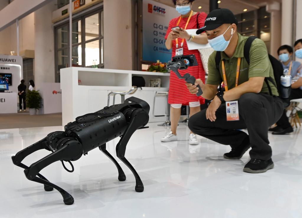 2021年9月8日,參觀者在廈門舉辦的金磚國家新工業(yè)革命展現(xiàn)場拍攝展出的智能機器狗。新華社記者林善傳攝