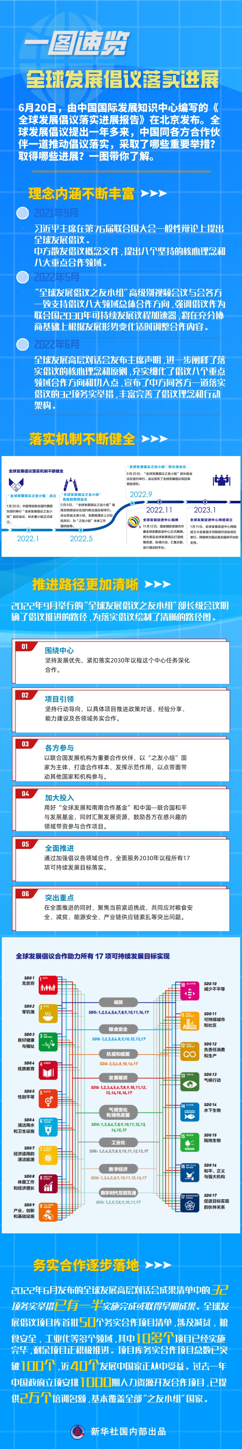 6月20日,由中國國際發(fā)展知識中心編寫的《全球發(fā)展倡議落實進展報告》在北京發(fā)布。全球發(fā)展倡議提出一年多來,中國同各方合作伙伴一道推動倡議落實,采取了哪些重要舉措?取得哪些進展?一圖帶你了解。