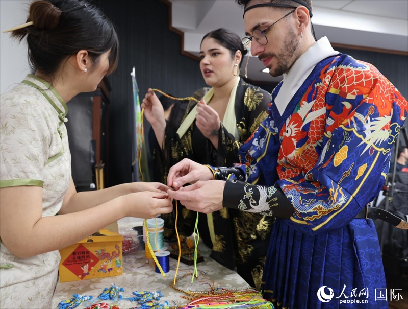 現(xiàn)場觀眾學(xué)習(xí)制作五彩繩。人民網(wǎng)記者 宋亦然攝 |
