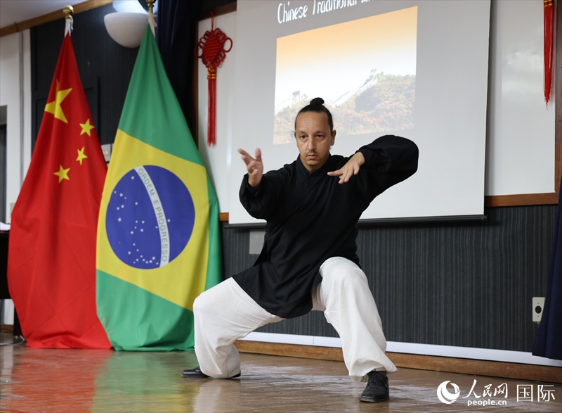 活動現(xiàn)場,主辦方為來賓播放了關(guān)于端午節(jié)起源等相關(guān)知識的文化推廣視頻,詳細(xì)介紹了端午節(jié)背后的人文內(nèi)涵,并根據(jù)視頻內(nèi)容設(shè)置了現(xiàn)場有獎問答活動。里約天主教大學(xué)孔子學(xué)院學(xué)生麗娜(Sabrina)和李思城(Vinicius)呈獻(xiàn)的詩詞朗誦《七律·端午》、《漁家傲》,有板有眼;學(xué)生龍莉茲(Beatriz)演繹的中文歌曲《如愿》,情深意切;教師張德君的一曲《離騷》,令人動容;孔院學(xué)生武林道武術(shù)學(xué)校的專業(yè)武術(shù)表演,贏得陣陣喝彩……