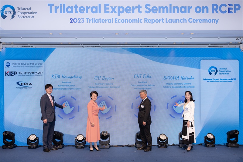 人民網(wǎng)首爾6月23日電 (記者馬菲)中日韓合作秘書處主辦的中日韓《區(qū)域全面經(jīng)濟(jì)伙伴關(guān)系協(xié)定》(RCEP)專家研討會(huì)暨《2023中日韓經(jīng)濟(jì)報(bào)告》發(fā)布會(huì)22日在韓國首爾舉行。中日韓合作秘書處秘書長歐渤芊致開幕辭,中國(海南)改革發(fā)展研究院院長遲福林、東盟·東亞經(jīng)濟(jì)研究所高級經(jīng)濟(jì)顧問阿拉丁·里諾、韓國對外經(jīng)濟(jì)政策研究院院長金興鐘作主旨發(fā)言。會(huì)議討論了中日韓三國在RCEP實(shí)施、經(jīng)濟(jì)影響最大化和區(qū)域經(jīng)濟(jì)一體化方面的合作空間。