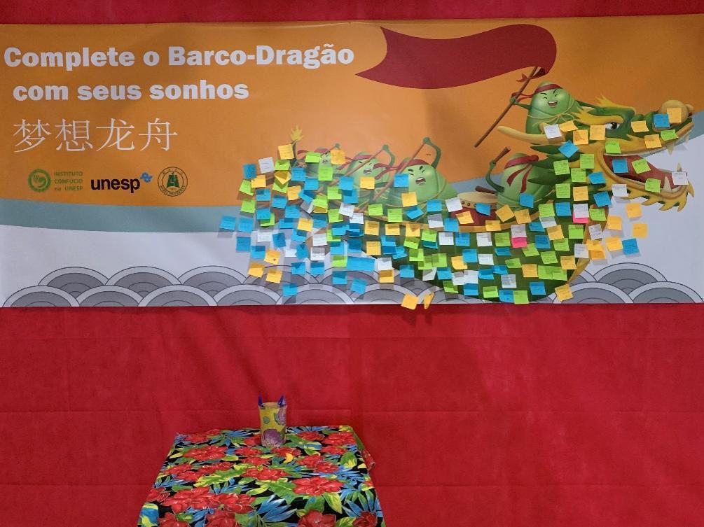 活動現(xiàn)場設(shè)置了“夢想龍舟”環(huán)節(jié),大家將自己寫下的心愿貼在“龍舟”上,期盼“龍舟”承載自己的夢想駛向更美好的未來。圣保羅州立大學孔子學院供圖
