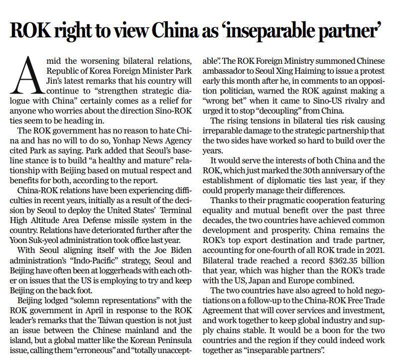 原標題:ROK right to view China as 'inseparable partner'