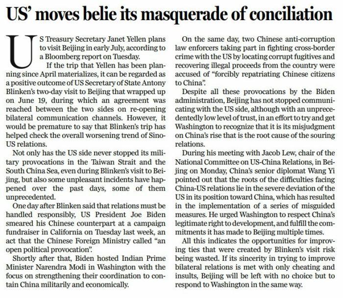 我們希望,布林肯訪華后兩國改善關系的契機不要白白浪費,但種種跡象表明,這種風險并非沒有。如果美方以欺騙和侮辱回報中方改善兩國關系的誠意,中國將不得不做出相應回應。