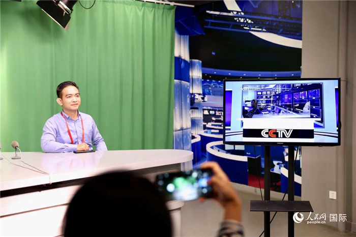 在傳媒博物館內(nèi),一名瀾湄合作媒體峰會研修班成員體驗當(dāng)新聞主播。人民網(wǎng) 李世奇攝 |