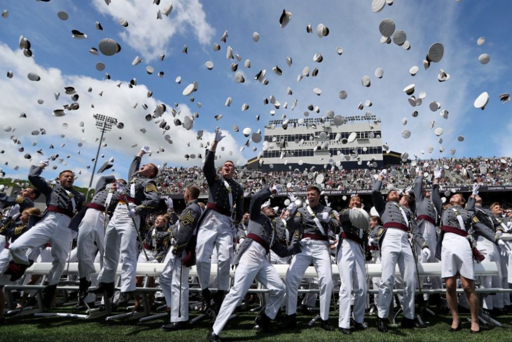 2017年5月27日,在位于美國紐約州北部的西點軍校,學員將帽子扔向空中慶祝畢業(yè)。新華社記者王迎攝
