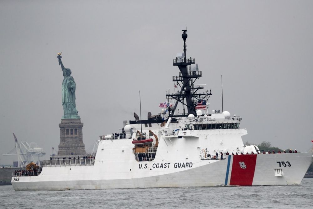 2017年5月24日,在美國紐約,美國海岸警衛(wèi)隊“漢密爾頓號”巡邏艦參加紐約艦隊周艦船巡游活動。新華社記者王迎攝