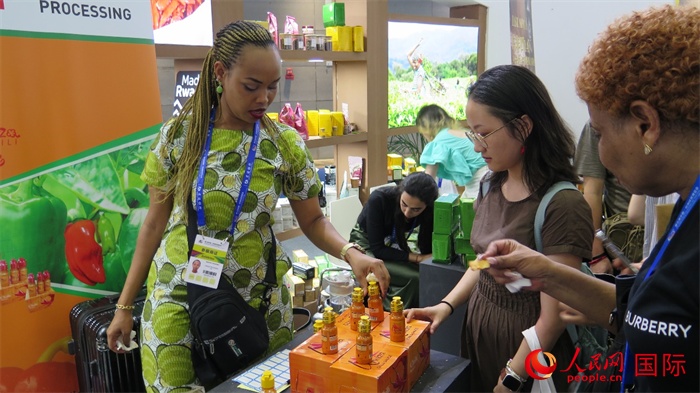 來(lái)自盧旺達(dá)的參展商為市民講解盧旺達(dá)辣椒制作的辣椒醬。人民網(wǎng) 宋歌攝