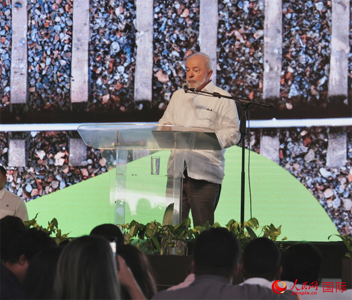 巴西總統(tǒng)盧拉在巴西東西鐵路項目開工儀式上發(fā)表致辭。人民網(wǎng)記者 宋亦然攝 |